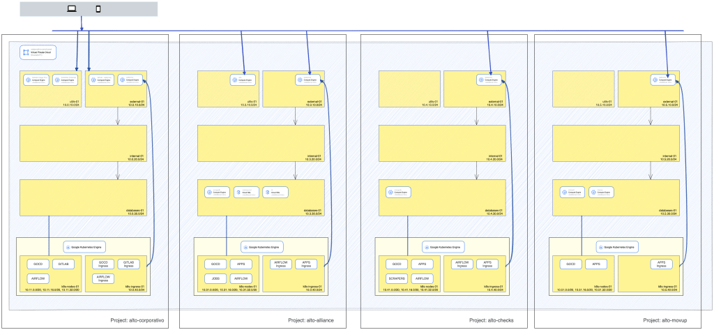 Para lograr este objetivo es necesario una plataforma computacionalmente correcta, por lo que ALTO Alliance está desarrollada bajo una arquitectura computacional de última generación que combina la potencia de la computación en nube (Google Cloud Platform (GCP)), la flexibilidad de los modelos de microservicios y la escalabilidad de la tecnología de Kubernetes sobre una sábana analítica desarrollada sobre R y Python, a continuación, se presenta la arquitectura del sistema. Esta arquitectura genera un ecosistema con una serie de características las cuales se destacan a continuación: