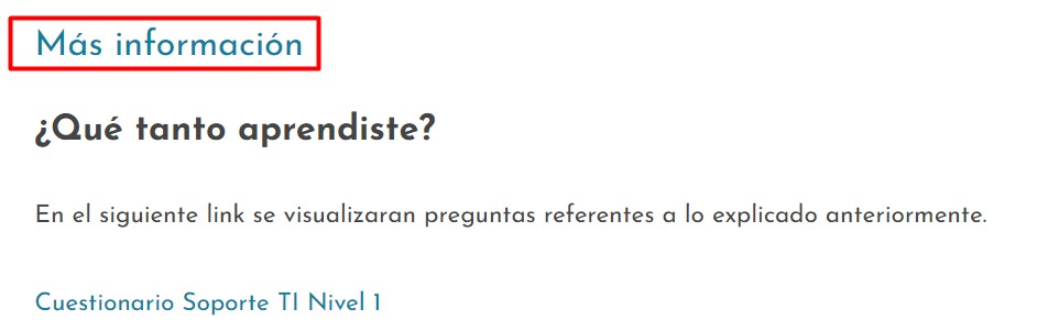 - Interno: Este cuestionario evalúa los conocimientos adquiridos en el documento nivel 2 del equipo.