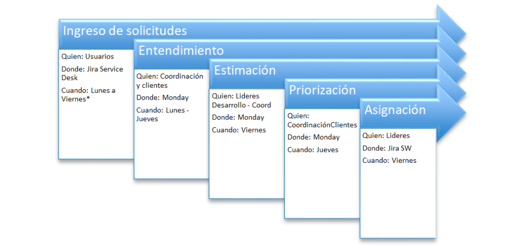 Muestra que pasa cada semana desde la recepción de la solicitud, pasando por el entendimiento, evaluación, estimación y priorización, hasta la solución del mismo desde la óptica del solicitante.